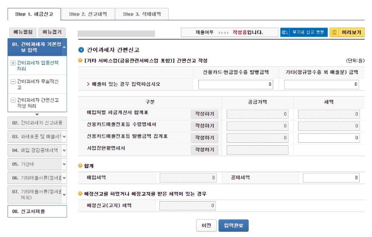 이후에는 바로 나오는 공제세액 입력 화면에서 [신고서 입력완료] 버튼 선택하시면 부가가치세 신고가 완료됩니다. 매년 1회, 종합소득세까지 2회 진행하는 것으로 세무사에게 더 정확하고 빠르게 진행되도록 맡겨도 좋지만 한번 쯤은 직접 해보면서 어떤식의 정보가 어떻게 입력되는지를 파악하고 있어야 나중에 세무사랑 논의해도 수월하고, 향후 간이과세자에서 일반과세자로 전환될 때에도 더욱 수월하게 세금 신고를 진행할 수 있을 것 입니다.