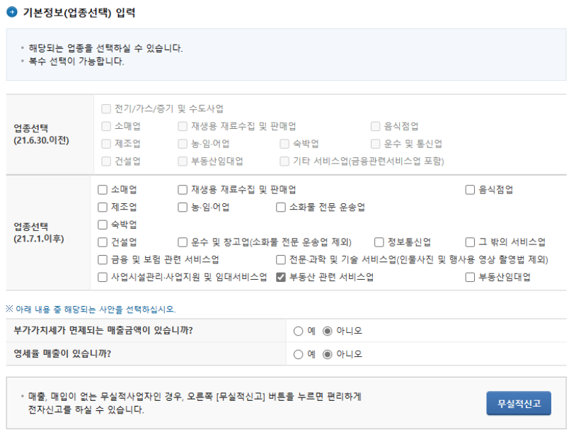 ② 사업자에 해당하시는 업종을 선택하시면 됩니다. 그 밖의 면제 매출 금액 등 기타 질문에 답 선택하면 됩니다. 또한, 매출이 없는 사업자의 경우에도 부가세는 신고해야 되므로, 바로 이 단계에서 [무실적신고]로 진행하시면 됩니다.