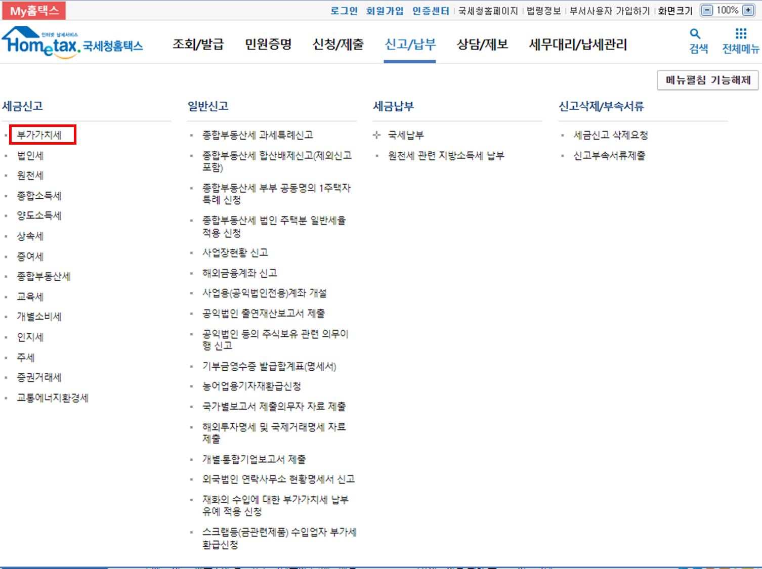 먼저 홈텍스 사이트에 접속하여 상단 메뉴의 [신고/납부] 선택하고 세금신고 카테고리의 [부가가치세]를 선택합니다. 혹은 신고납부기간이라면 홈텍스 웹페이지 접속시 부가세 신고 팝업이 노출되는데 이를 통해서도 간편하게 접속할 수 있다.