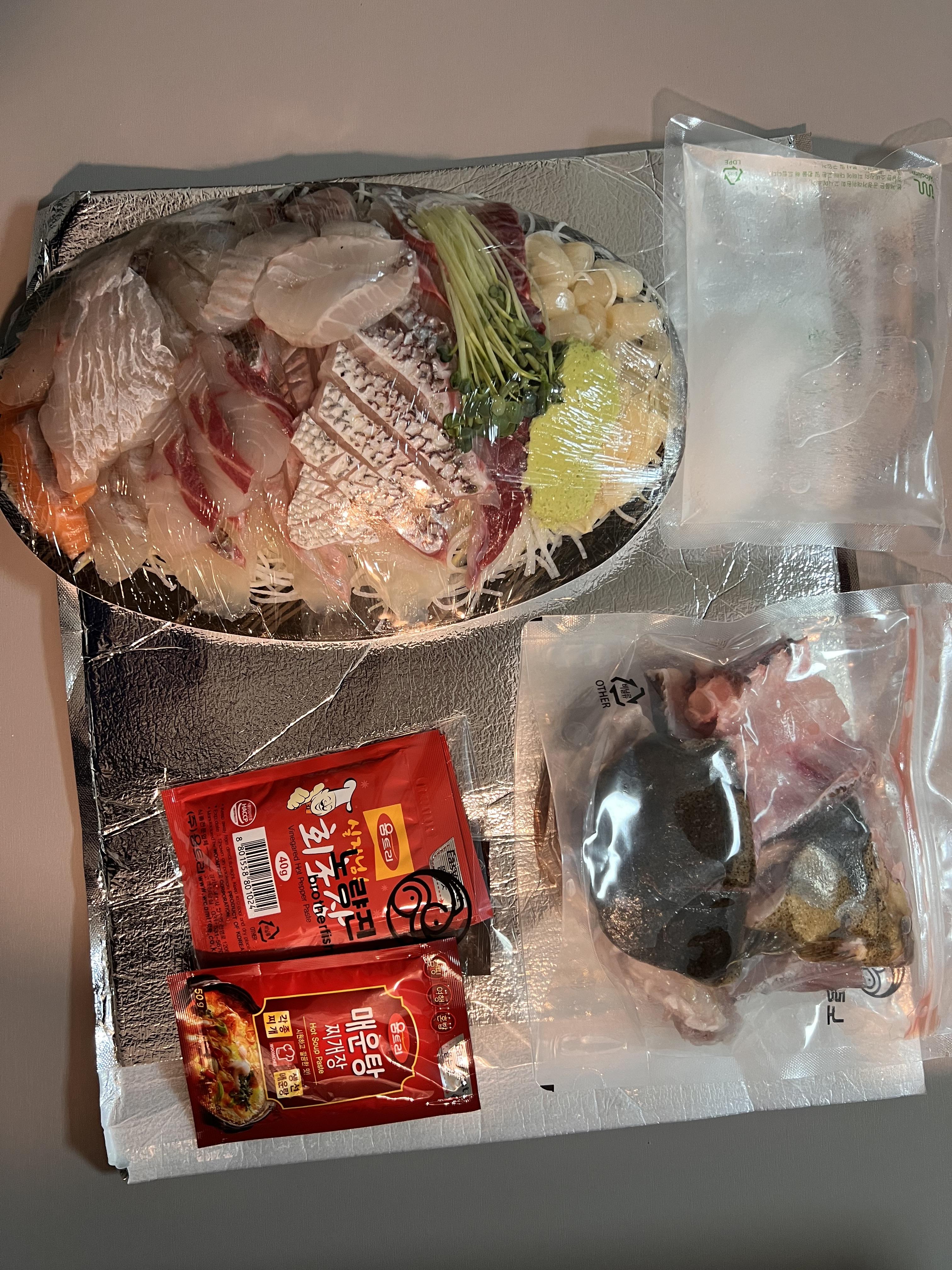 주문한 회의 포장상태는 신선함이 잘 유지되도록 보온/냉 팩 안에 넣어서 주시구요. 그리고 무엇보다 모듬회라고 해서 매운탕 거리를 절대 무시하시면 안됩니다. 형제상회의 경우 주문이 워낙 많다보니까 매운탕을 안드시는분도 많으셔서 오히려 매운탕 거리가 정말로 푸짐합니다. 이게 정말 큰 장점인 것 같아요. 매운탕 소스까지 주셔서 집에서 끓여 먹는데도 간단하답니다.