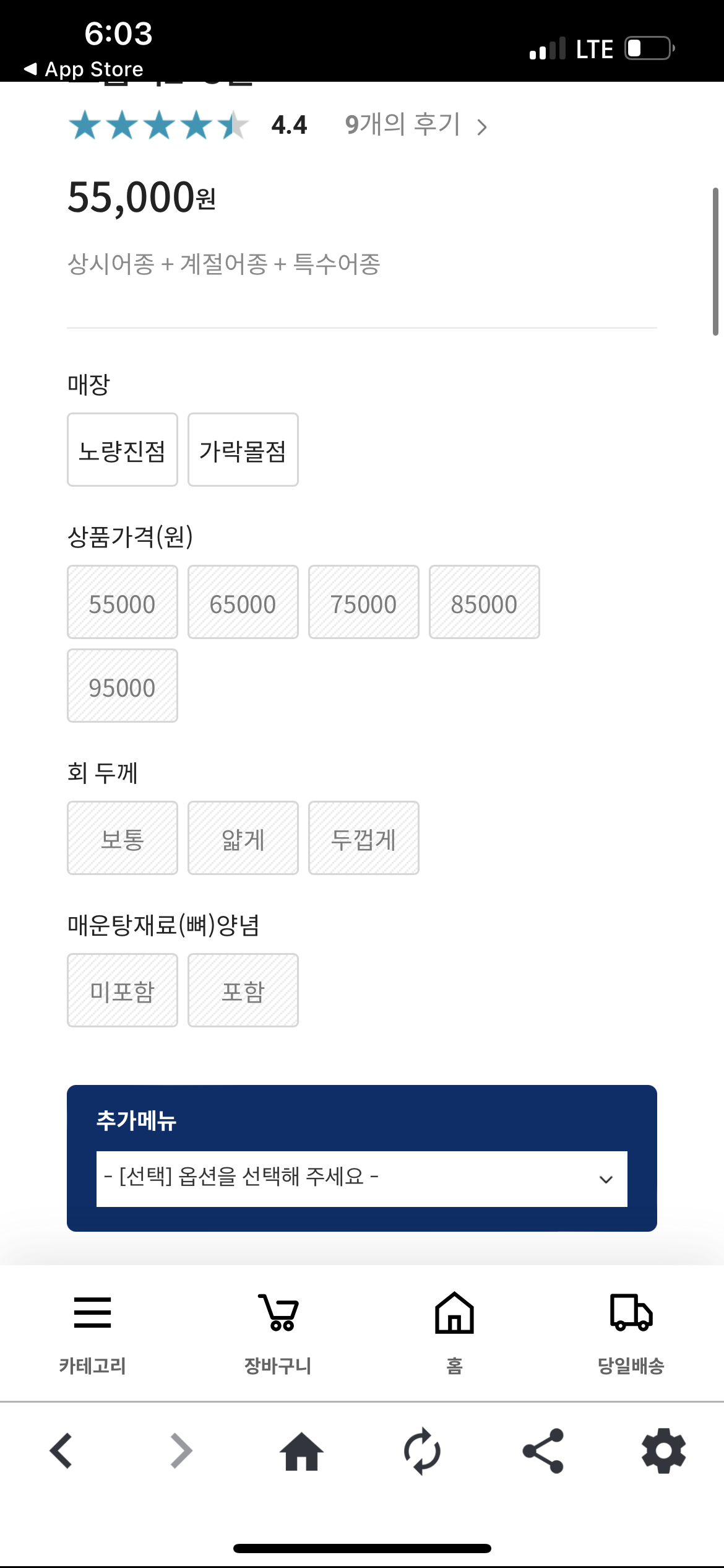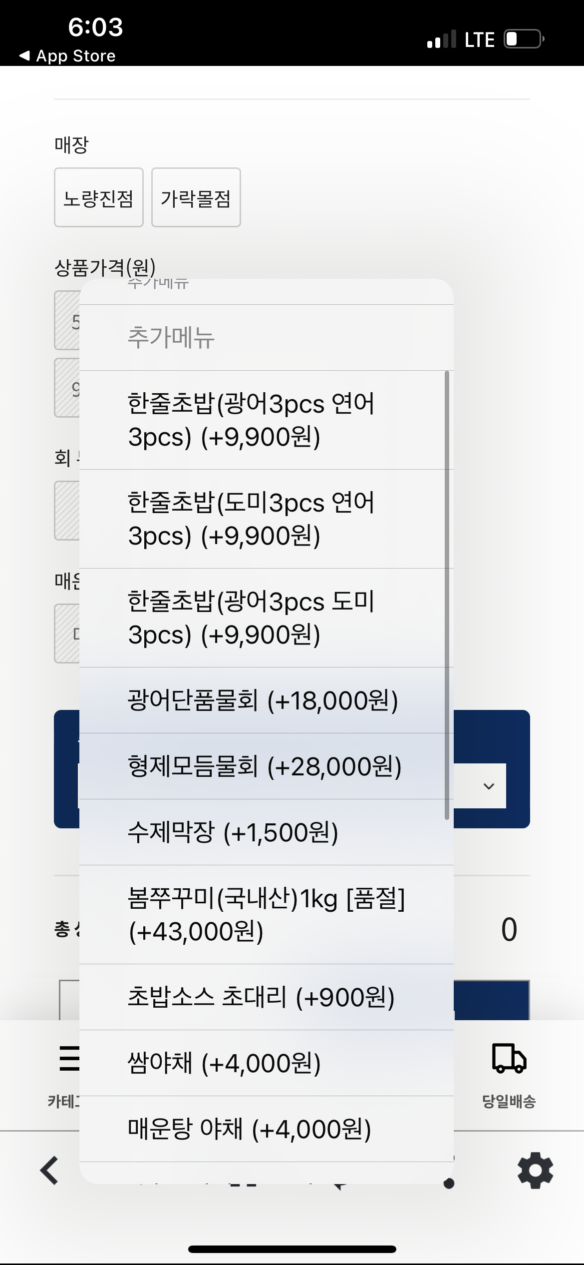 제가 주문한 모듬회 2~3인으로 한번 설정 해보았는데요. 키오스크와 동일하게 회 두께부터 매운탕 재료까지 선택할 수 있고, 참고로 형제상회는 노량진점 뿐만 아니라 가락시장에도 들어가 있어서 매장을 선택해야 합니다.