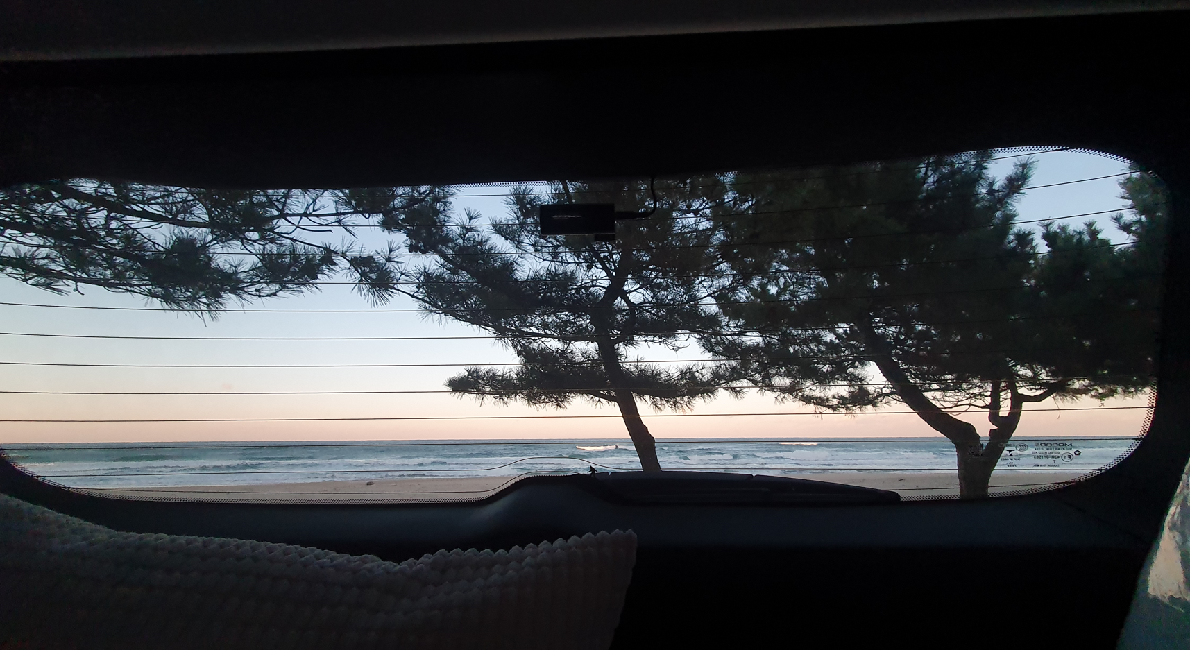 열심히 뒷자리 평탄화 세팅 하고 잠시 앉아서 차안에서 바라보는 바닷가 모습, 이때도 파도 소리는 ASMR처럼 들려옵니다.