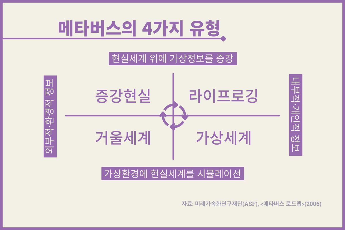 메타버스를 연구하는 기술 연구 단체인 ASF(Acceleration Studies Foundation)은 메타버스를 구현 공간의 기준이 현실 또는 가상인지, 그리고 구현 기술이 외부 또는 내부(이용자)인지 에 따라 증강현실, 라이프 로깅, 거울 세계, 가상세계 4가지 유형으로 구분하였습니다. 자세히 살펴보겠습니다.