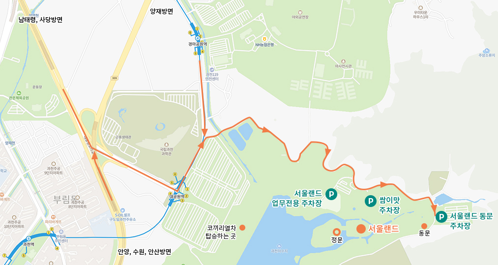 이렇게 과천과학관이나 인근 주차장에 주차하실 경우, 서울랜드 동문 주차장까지 걸어서 15분 소요되며,