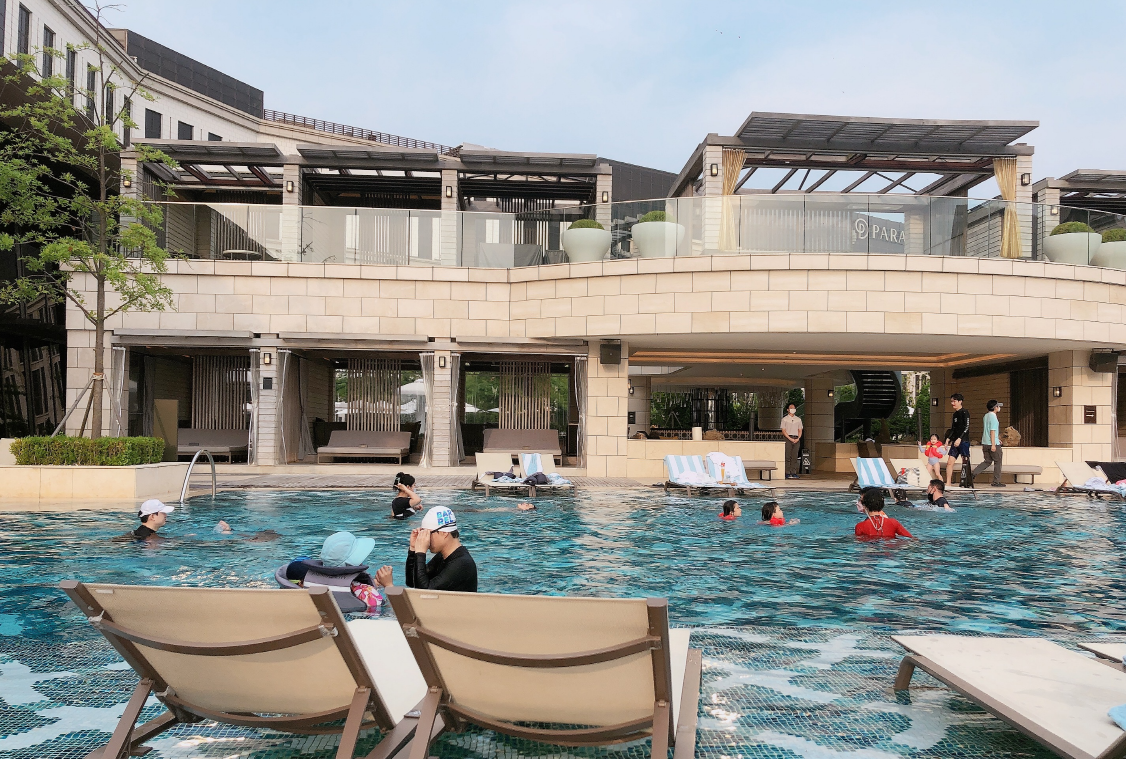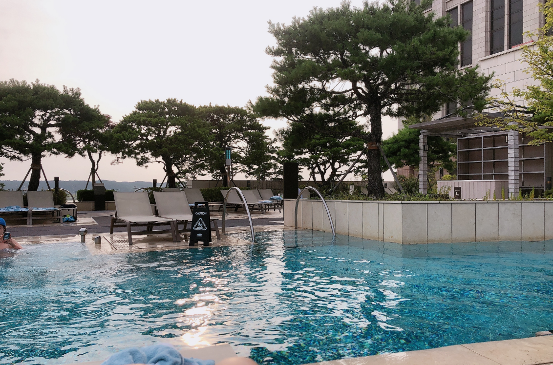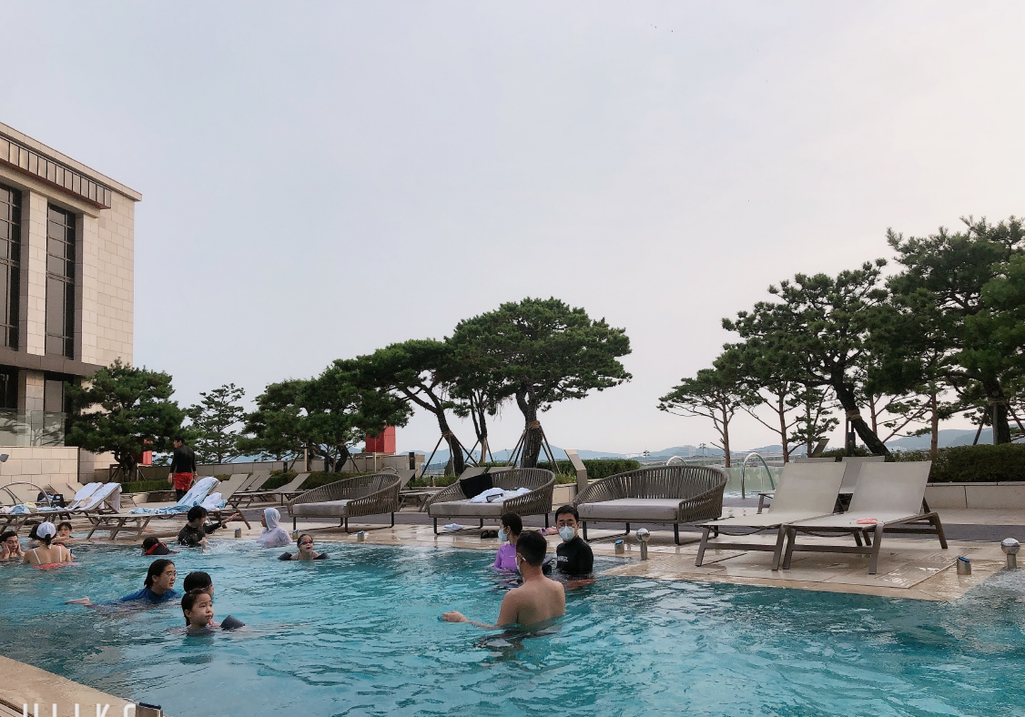 파라다이스 시티의 자랑인 인피티니풀 수영장은 말그대로 지상낙원! 크게 2개의 수영장과 3개의 자쿠지로 되어 있는데요. 생각보다 넓어서 수영을 할 수 있을 정도입니다. 무엇보다 수영장 넘어 멀리 보이는 경치가 서울에서 1시간 걸려 와서 볼 수 있는 경치인가 싶을 정도로 정말 휴양지 리조트 온 느낌이 물씬 납니다.