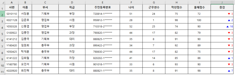 간단히 설명드리기 위해 예제를 위와 같이 드리겠습니다. 가장 우측에 증감이라고 해서 [올해점수-작년점수]의 값을 표시하였는데요. -3은 감소한거고, +2는 증가한거라고 보시면 됩니다. 자! 여기서 그럼 어떻게 음수값과 양수값에 따라 자동으로 화살표 표시 및 컬러 표시를 하는지 말씀드리겠습니다.
