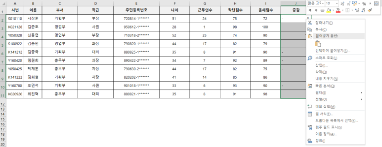 변경 대상 영역을 블록 지정하고 우측 마우스를 선택합니다. 그리고 셀 서시 버튼을 선택합니다.