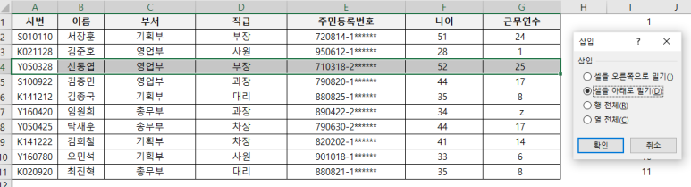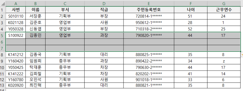 위와 같이 표가 있다고 가정하고, 여기서 김종민 영업부 과장 행 아래에 신규 행을 추가하고자 합니다. 보통이면 이때 5번행 마우스 우측 버튼을 클릭하면 메뉴가 나오고 행추가 버튼 클릭하여 신규 행이 추가가 됩니다. 기준이 되는 행을 블럭하고 Shift 버튼을 선택한 상태에서 블록 지정의 우측 아래 초록색 꼭지점을 마우스로 드래그하여 아래로 늘리면 자동으로 신규 행이 추가 됩니다.
