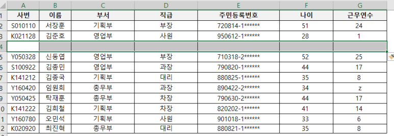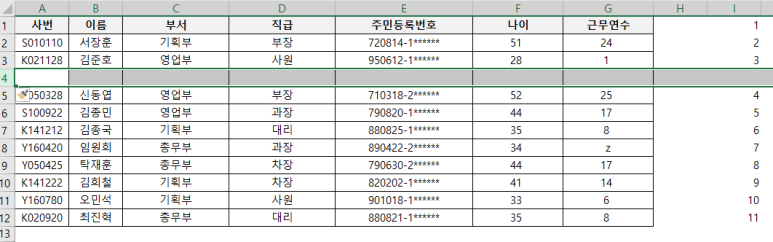 바로 이런식으로 추가됩니다. 다시 신규 행을 없애기 위해서도 동일하게 블록 지정 영역의 우측 아래 꼭지점을 마우스로 드래그하여 움직이면 됩니다.