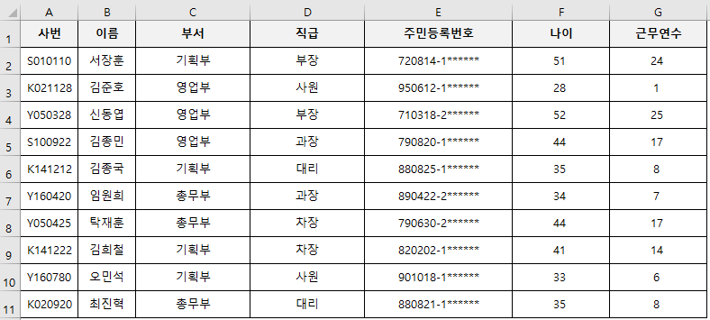 팀원들의 명단 정보가 아래 표와 같이 있다고 가정합니다.
