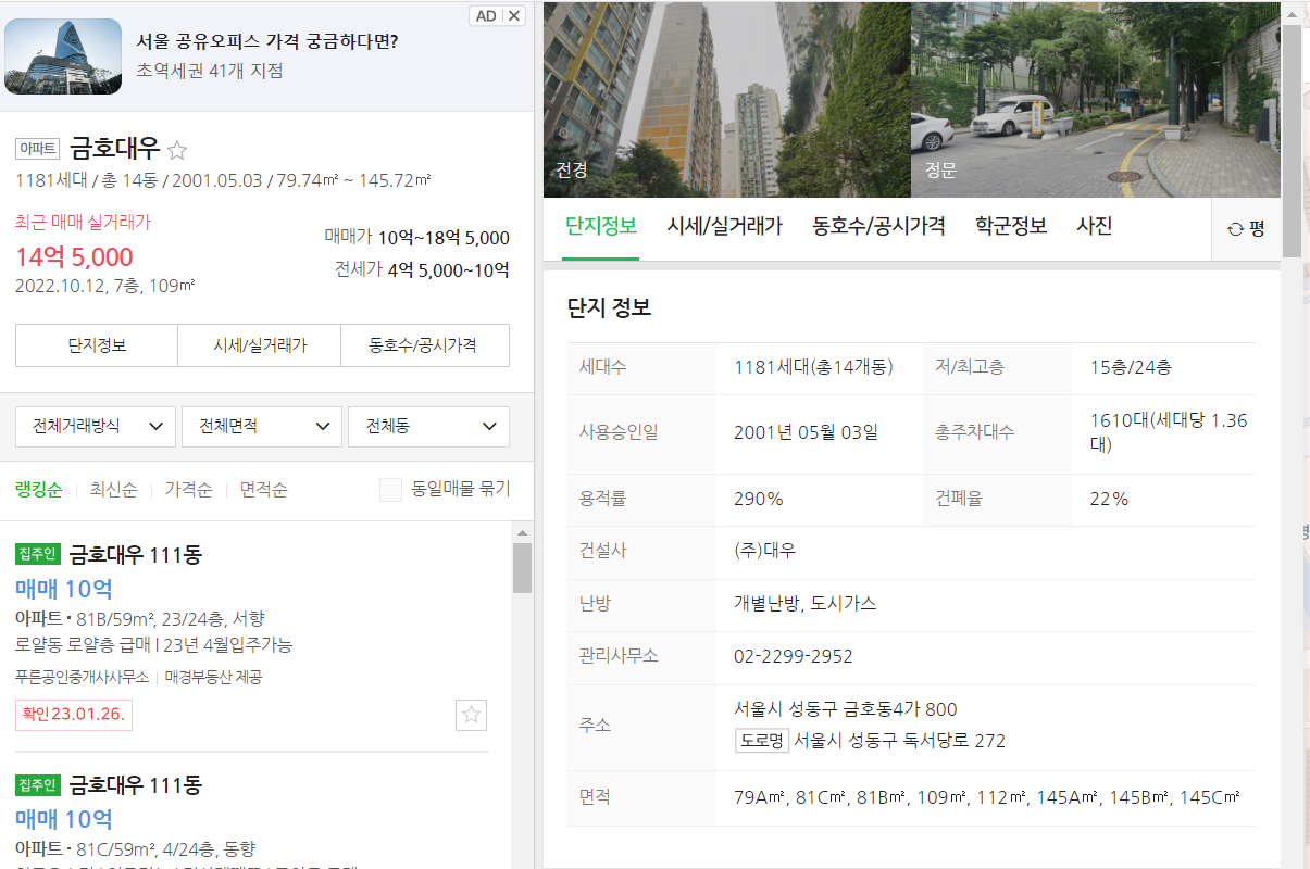 부동산 매물 조건은 아래와 같이 매물을 선택하면 나오는 화면이고 여기서 매물 조건들을 확인할 수 있다.