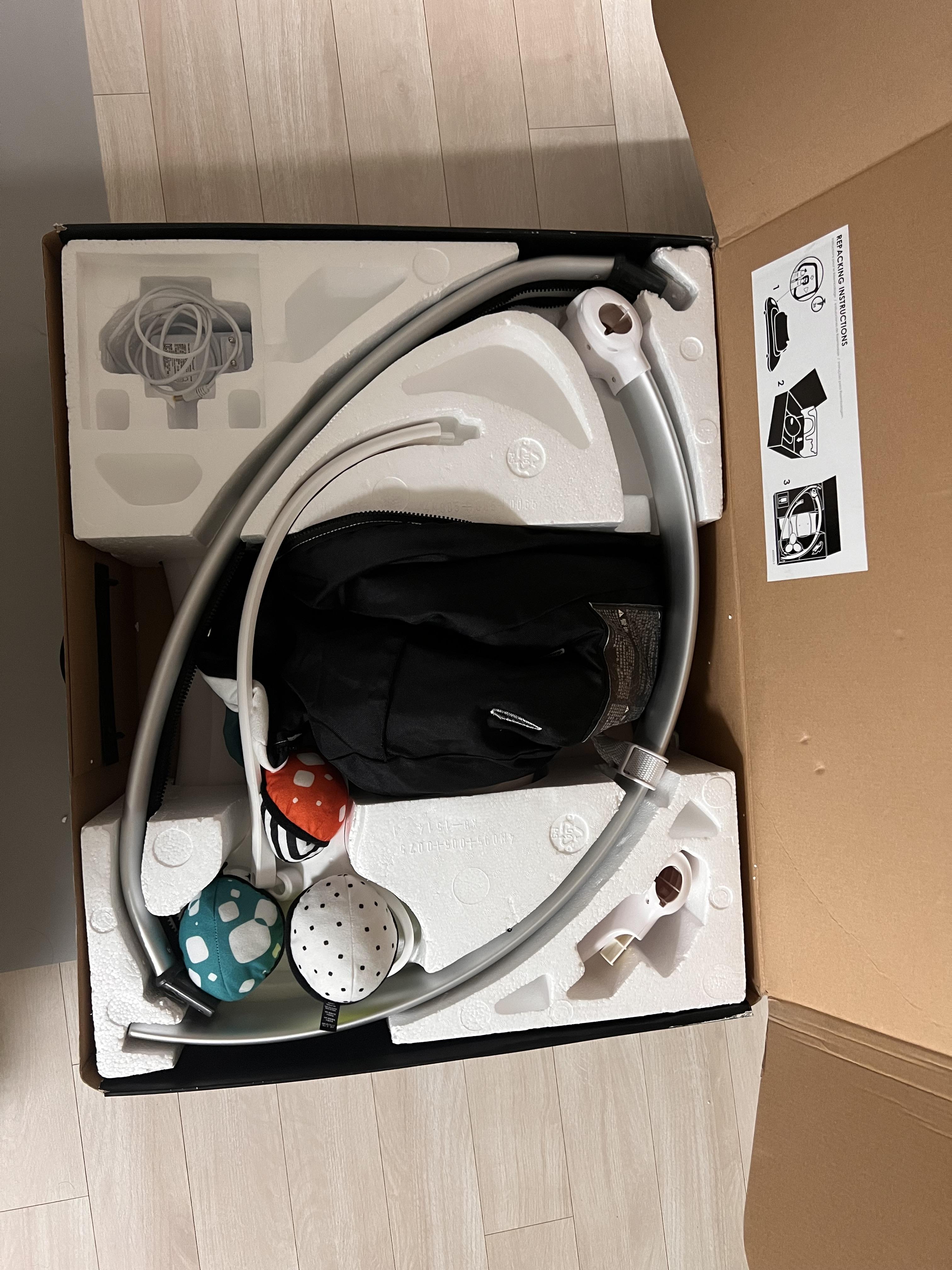 처음 박싱 상태부터 보시면 컴팩트하게 박스 안에 다 포함되어 있고 구성품은 본체 + 왼쪽 바, 오른쪽바 + 모빌대 + 모빌공 3개 +어댑터 + 시트 이렇게 라고 보시면 됩니다.